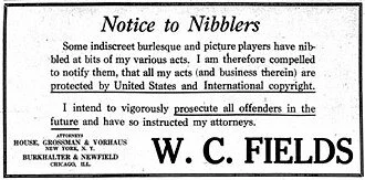 W.C. Fields started his career as a juggler. Silent films opened him up to a wider audience, one that could more easily “borrow” bits. To prevent “joke theft,” Fields began copyrighting his material. In 1919, he warned other performers with this ad in Variety: